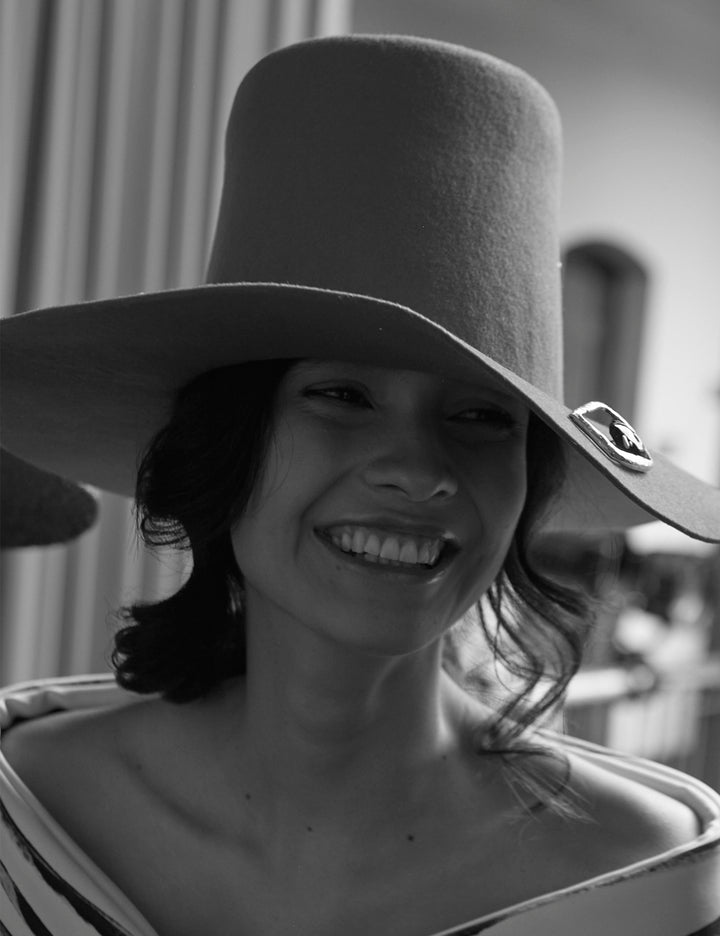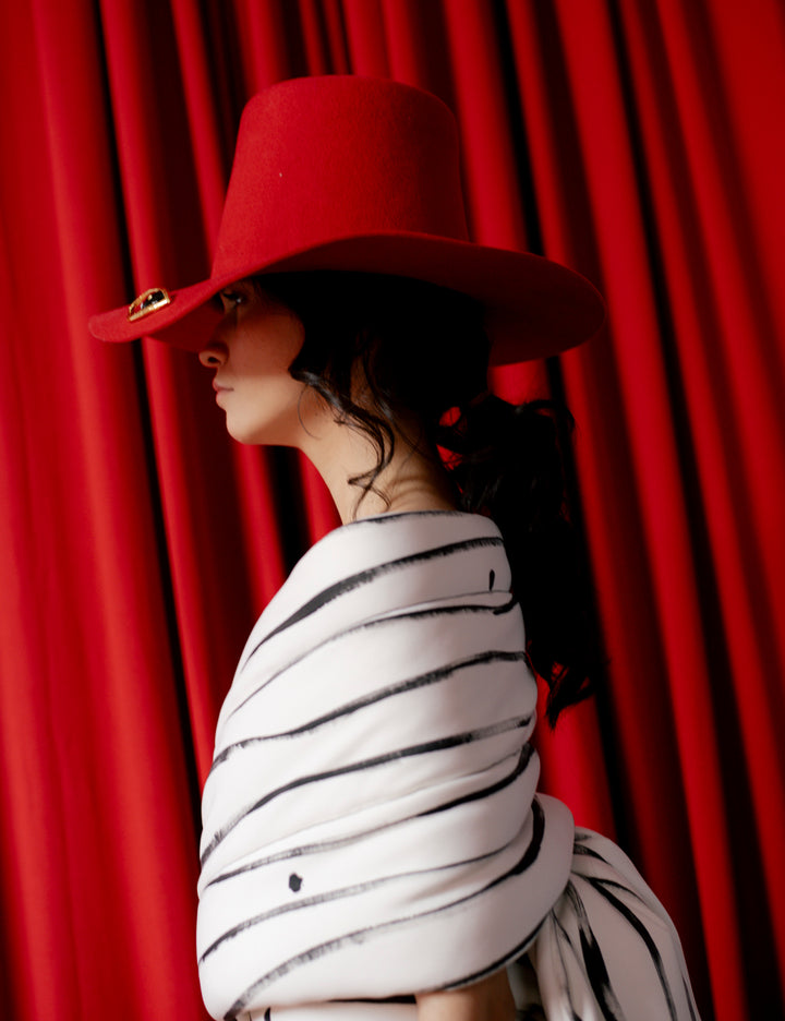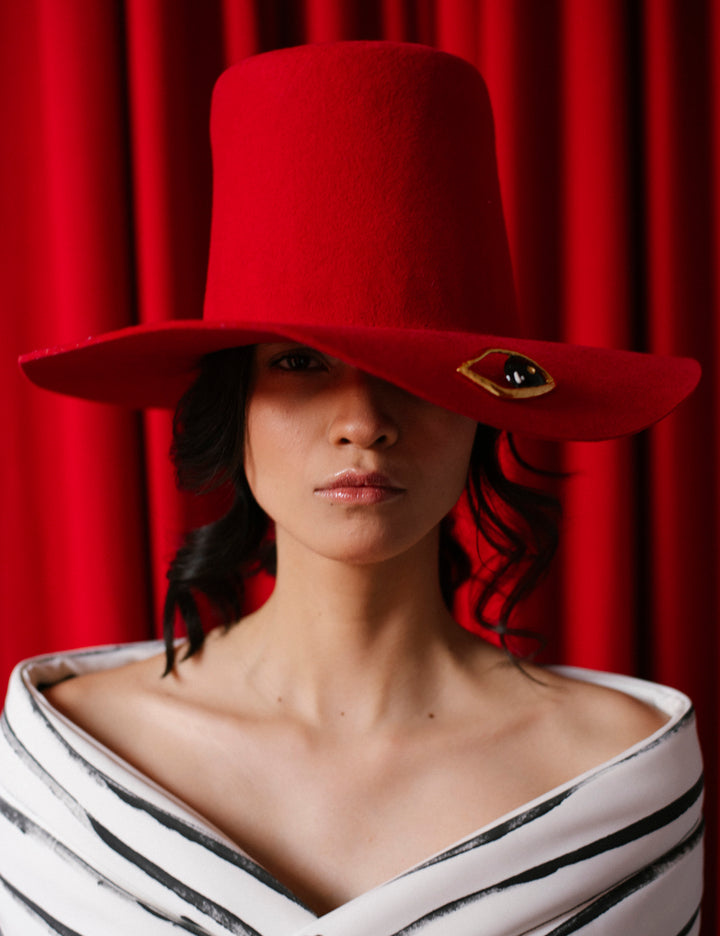 Sombrero en fieltro de Lana, color rojo, copa alta y ala caída hacia un lado, ojo en la caída del ala.